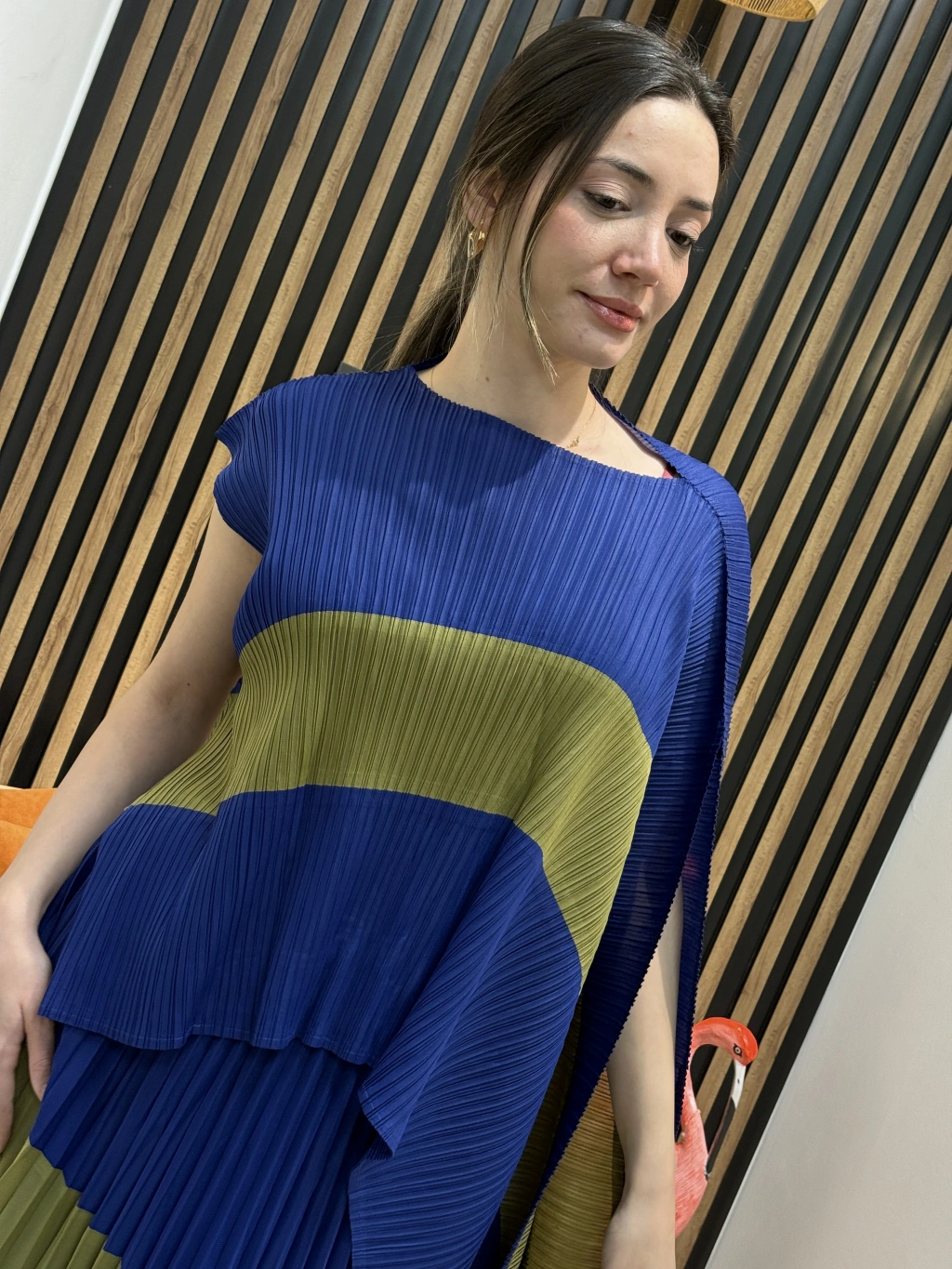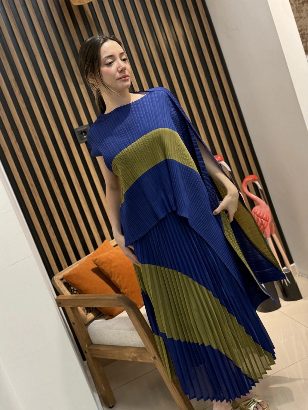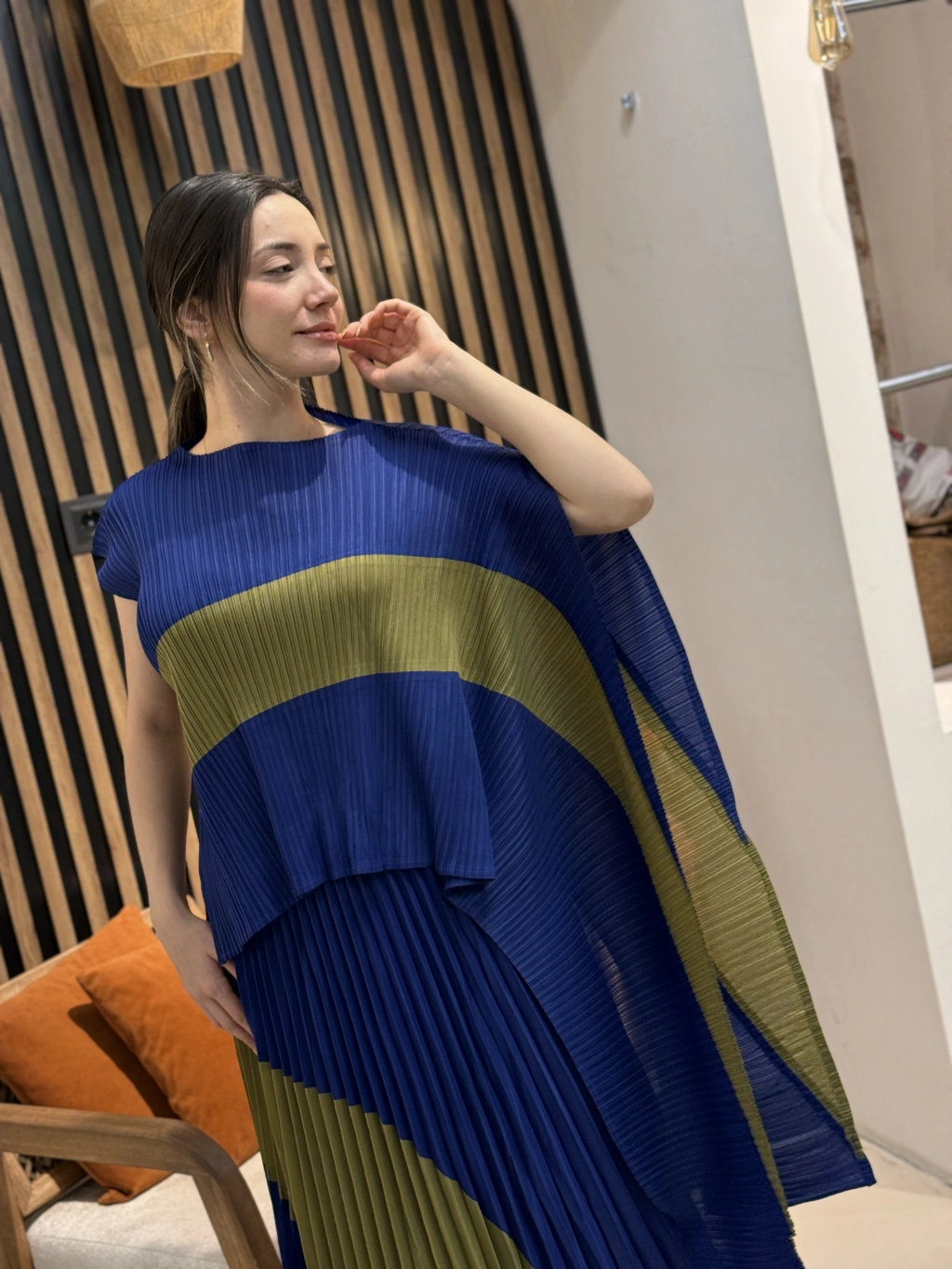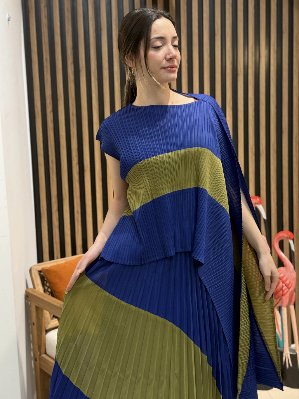 Aria Renk Bloklu Pliseli 2’li Takım, kontrast renk geçişleri ve akışkan pliseli dokusuyla dinamik bir siluet sunar. Salaş kesimi sayesinde gün boyu konfor sağlarken, renk blok tasarımı stilinizi güçlü ve dikkat çekici hale getirir.
