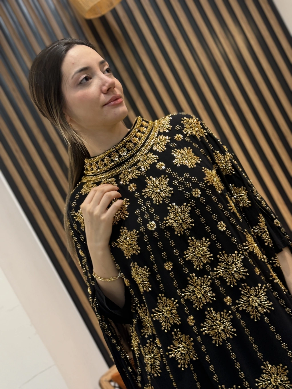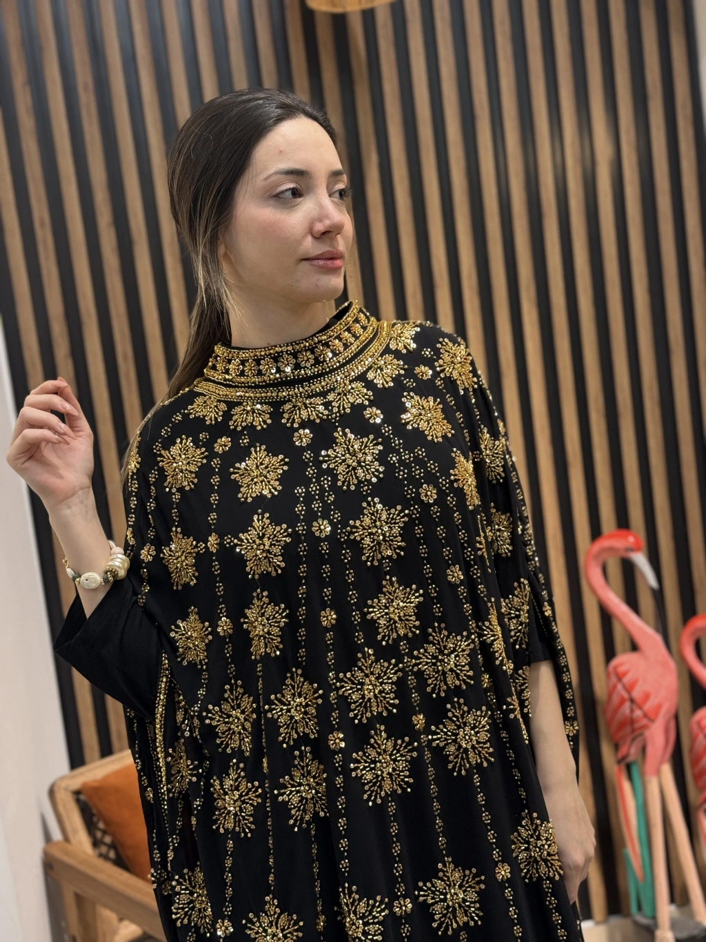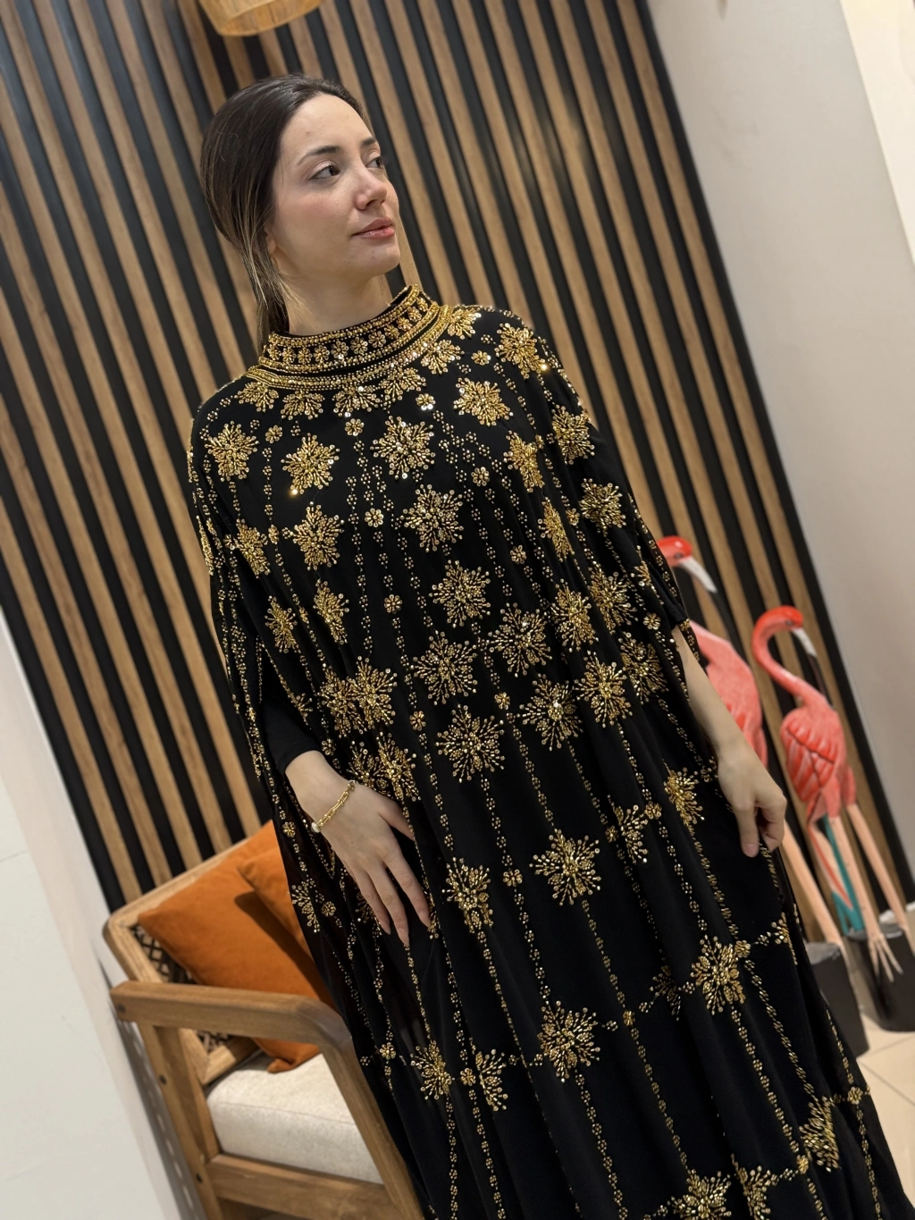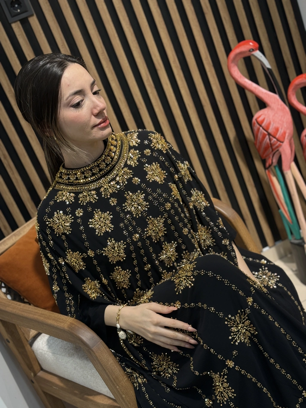 Zarafetin en ışıltılı hali… Siyah şifon kumaş üzerine özenle işlenmiş gold detaylarıyla bu abaya, özel gün stilinizi bir üst seviyeye taşır. Hafif ve akışkan yapısı sayesinde vücutta zarif bir duruş sergiler.