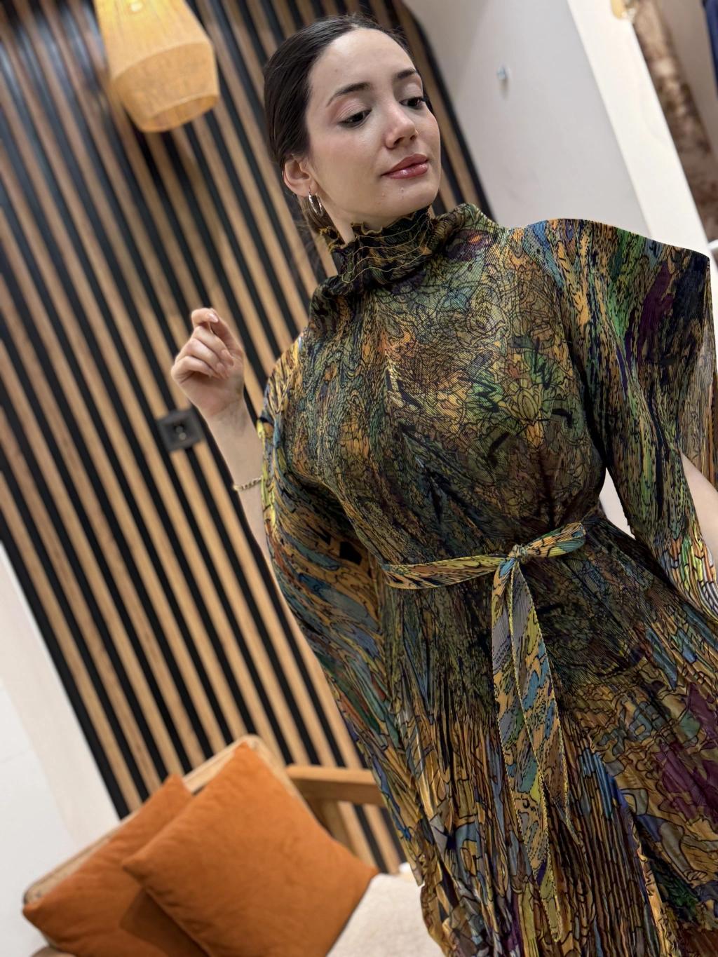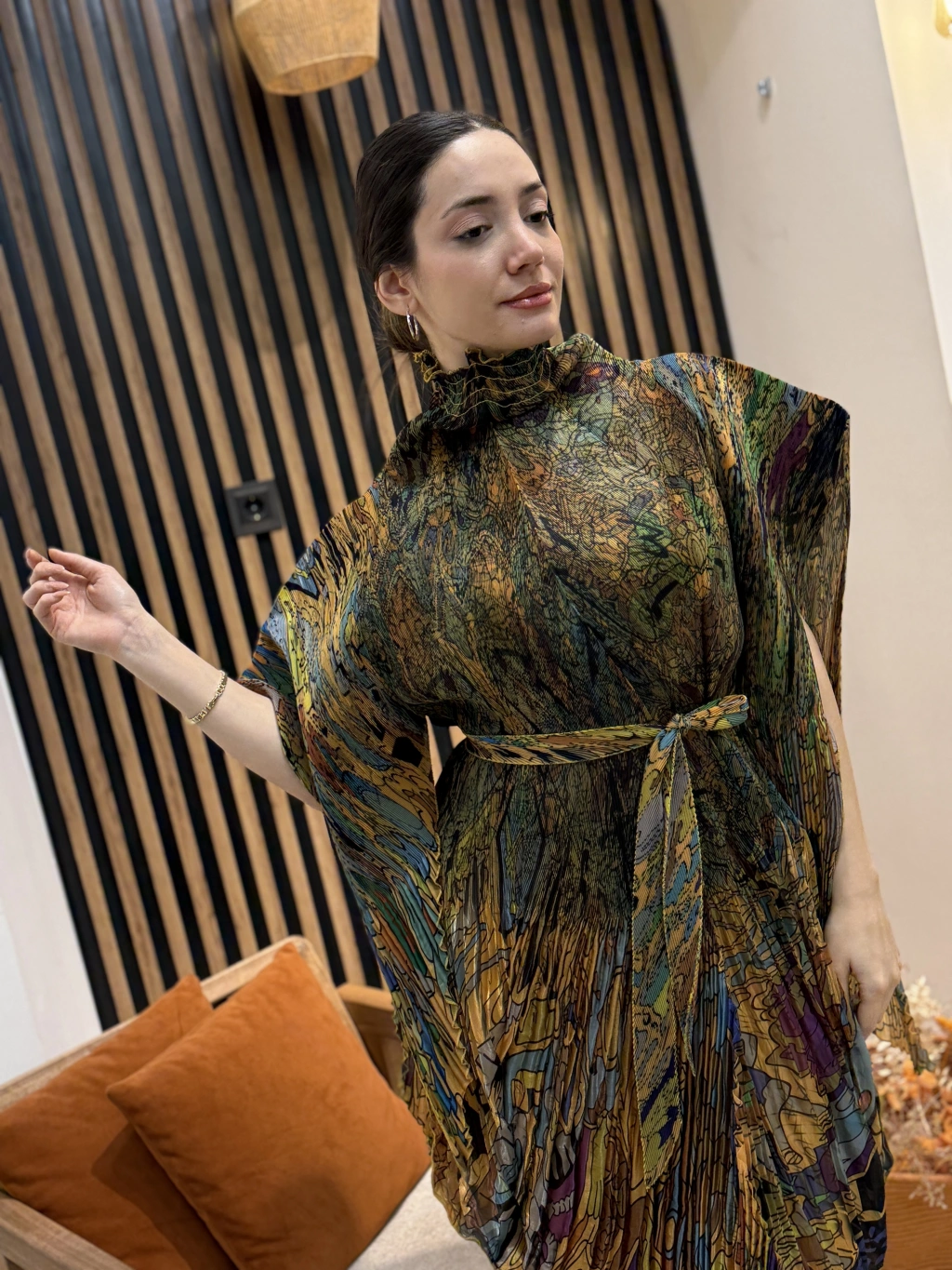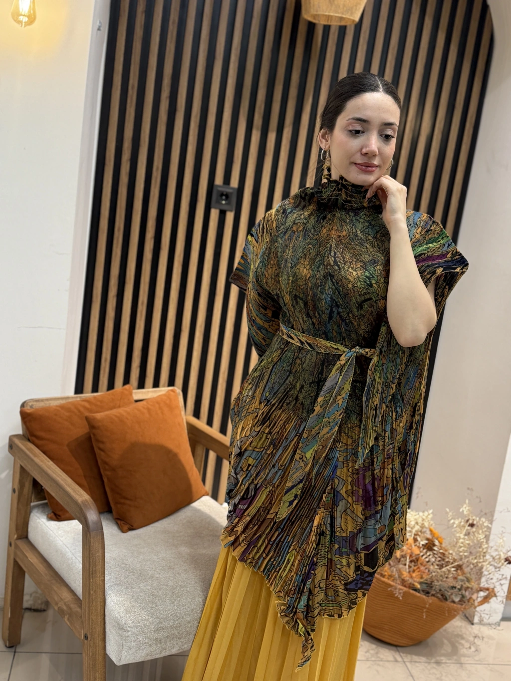 Yarasa kol kesimi ve yüksek yaka detayı modern bir duruş kazandırırken, belden bağlamalı kuşak formu vücuda zarif bir siluet verir.
