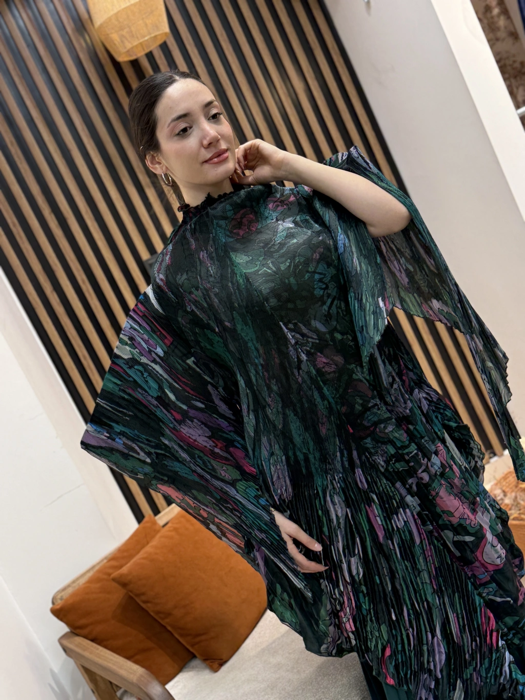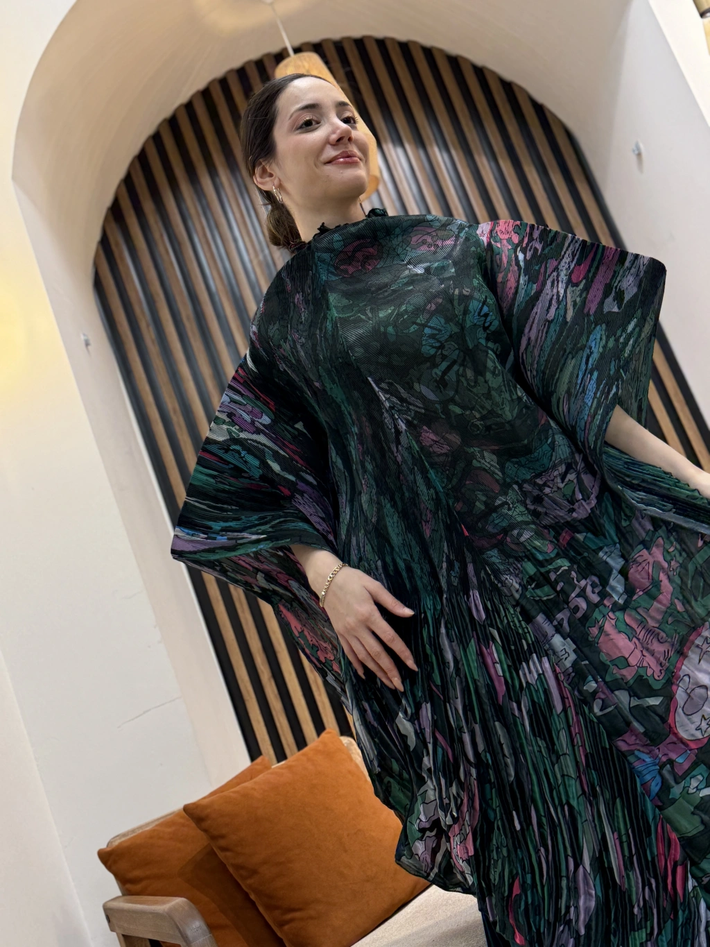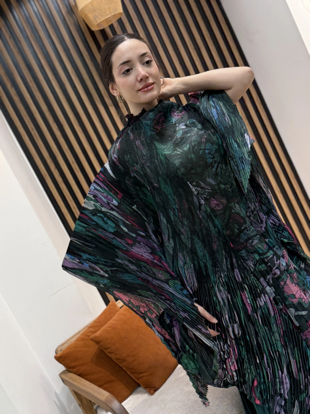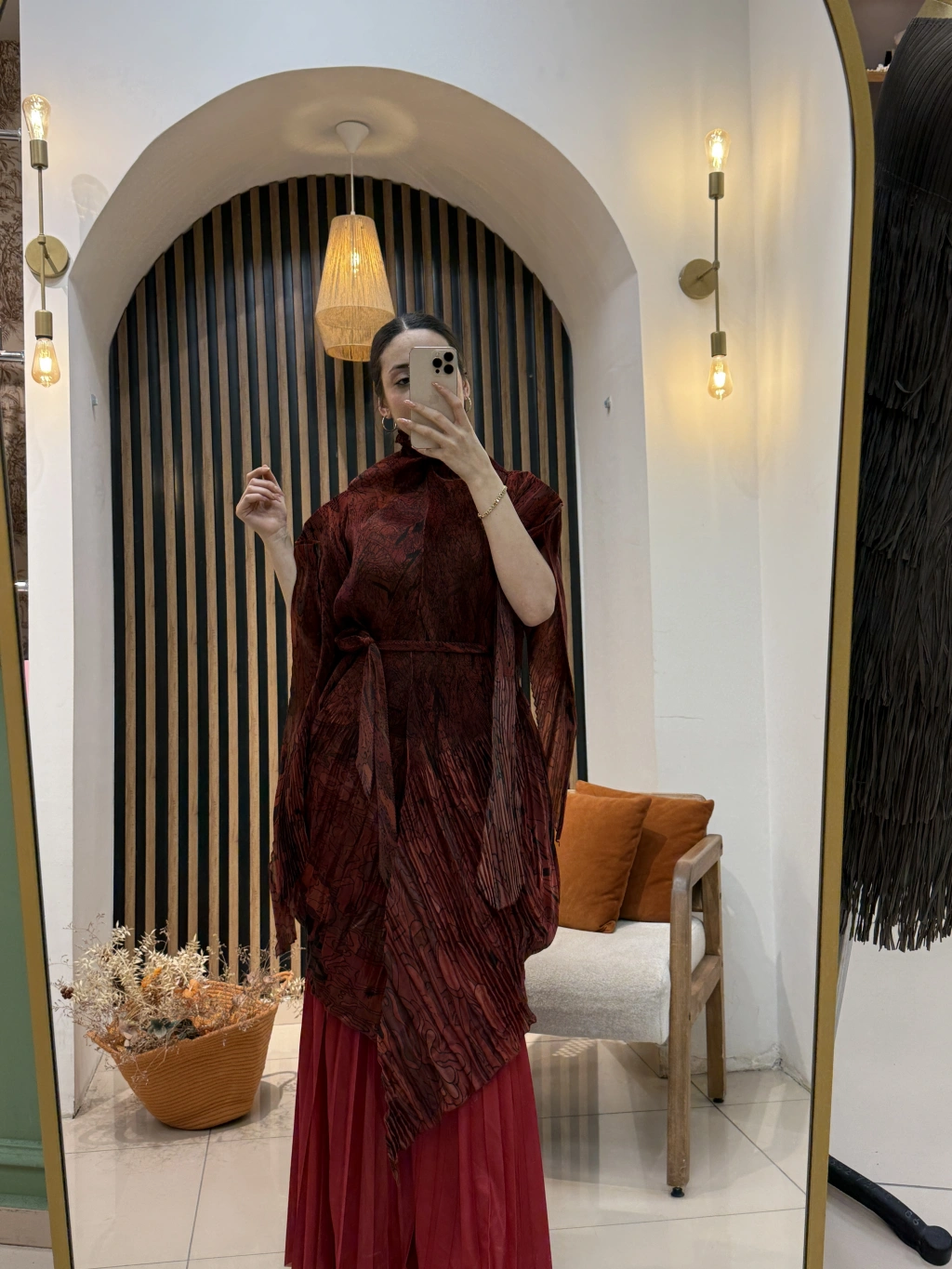 Yarasa kol kesimi ve yüksek yaka detayı modern bir duruş kazandırırken, belden bağlamalı kuşak formu vücuda zarif bir siluet verir.