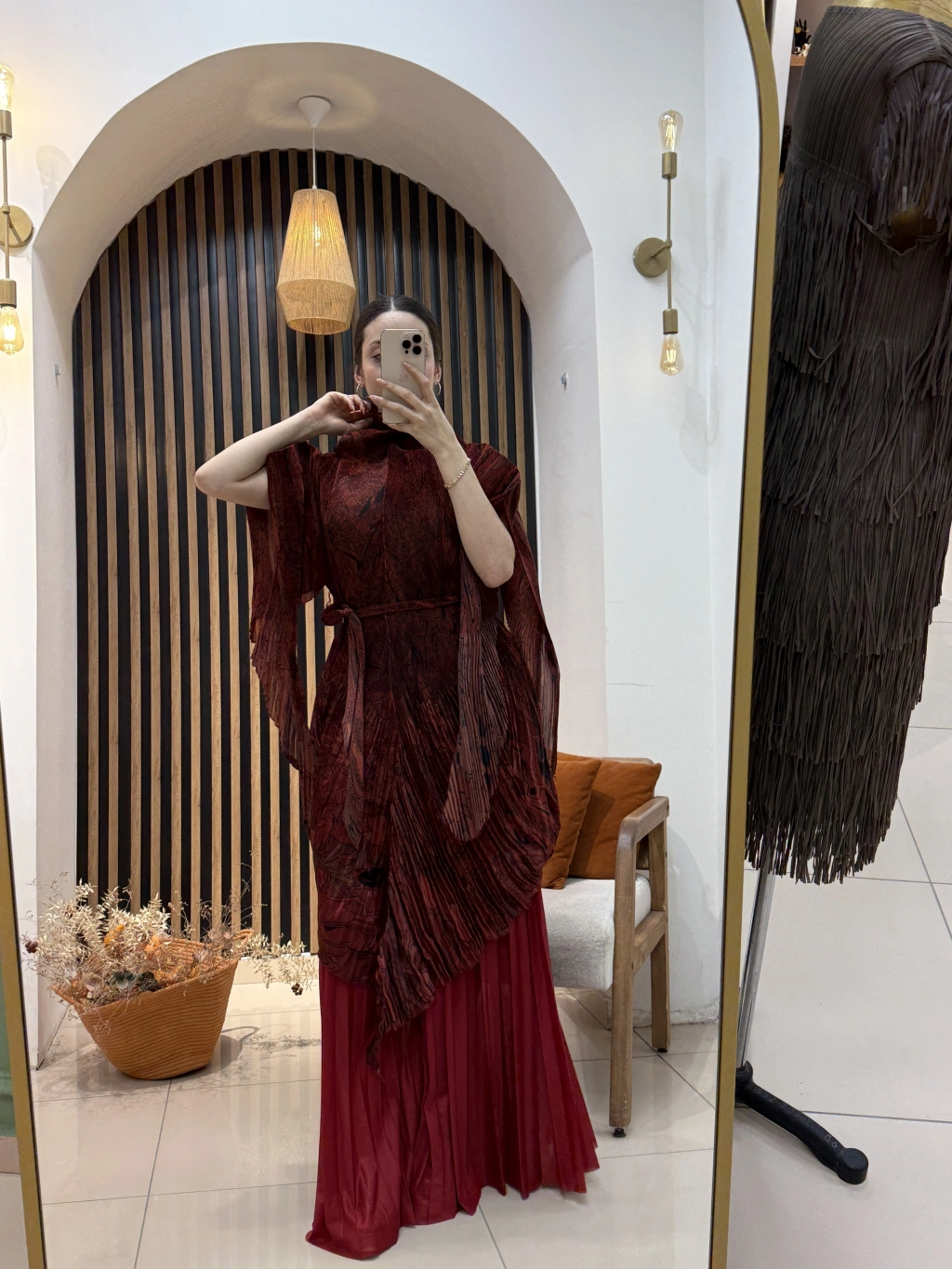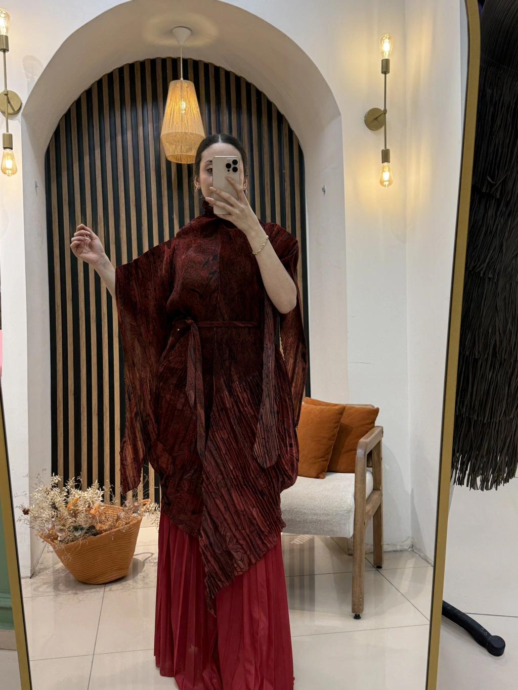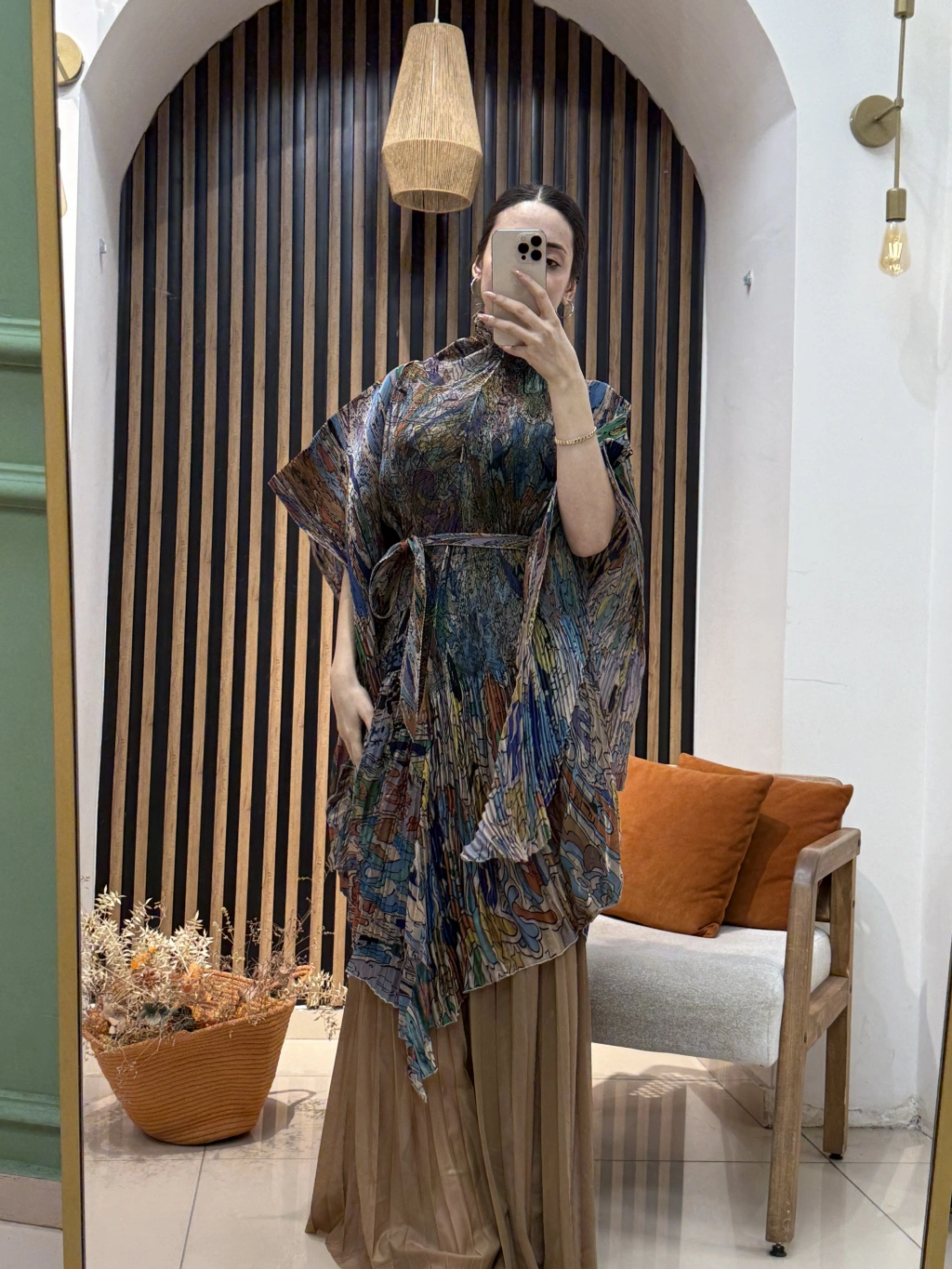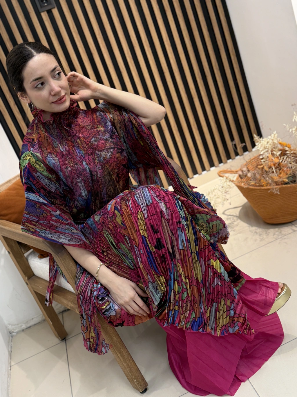 Hera Desenli Şifon İkili Takım, etek görünümündeki pantolonu sayesinde hem zarif hem de konforlu bir kullanım sunar. Akışkan şifon dokusu ve hareketli pliseli yapısı ile yürüdükçe şıklığını ortaya çıkarır.