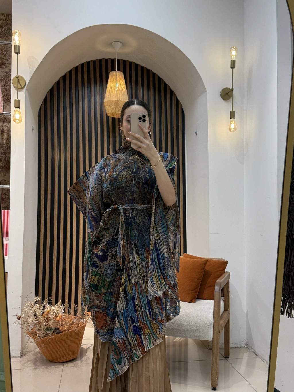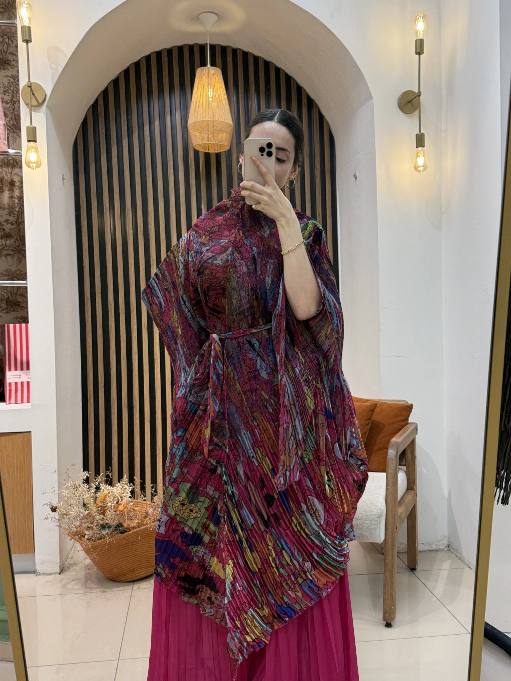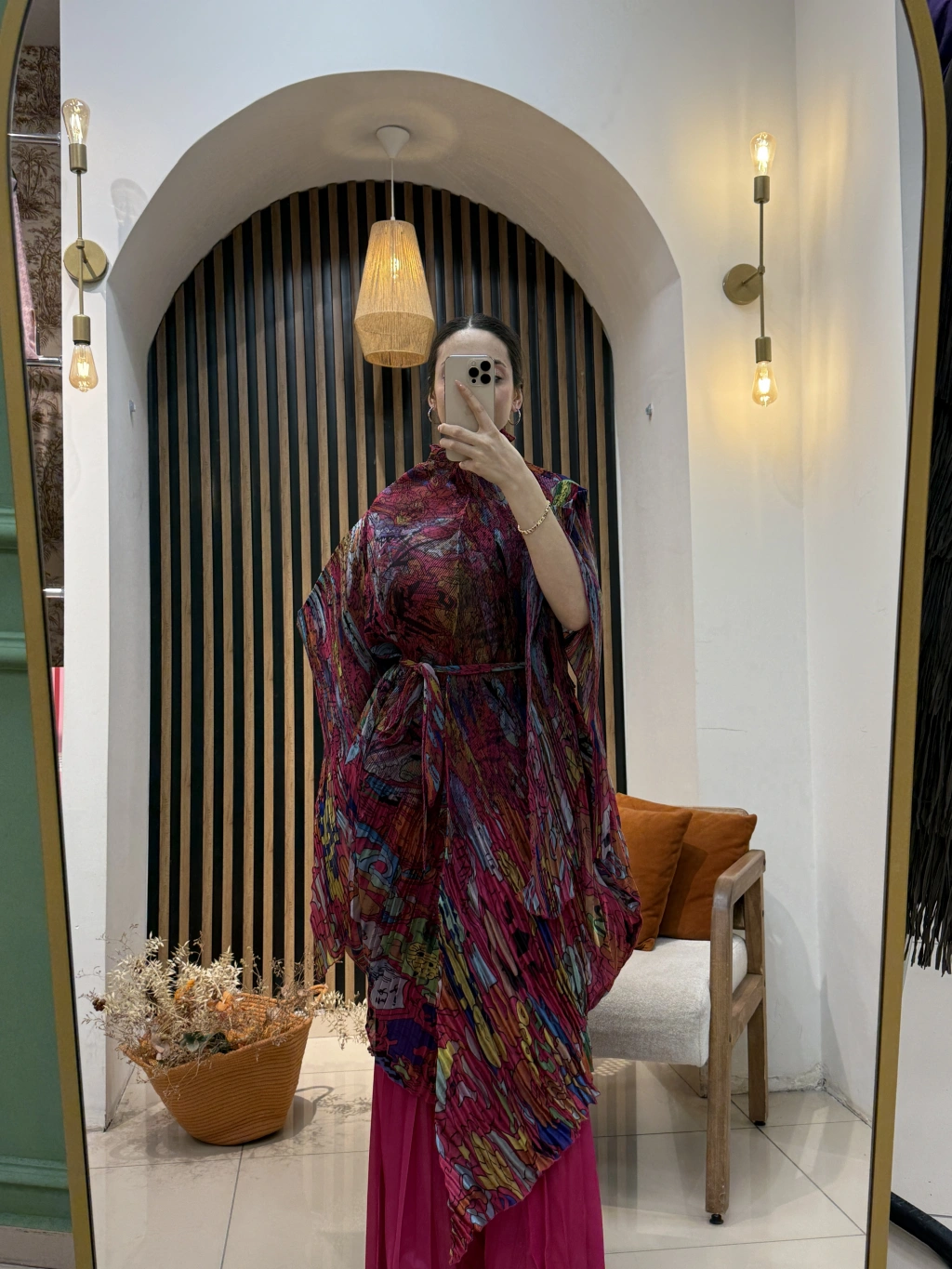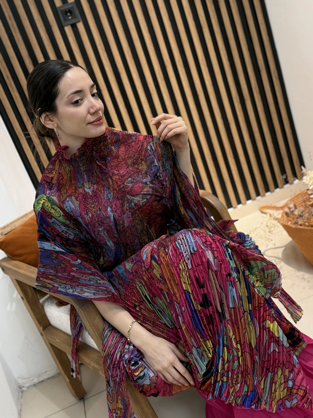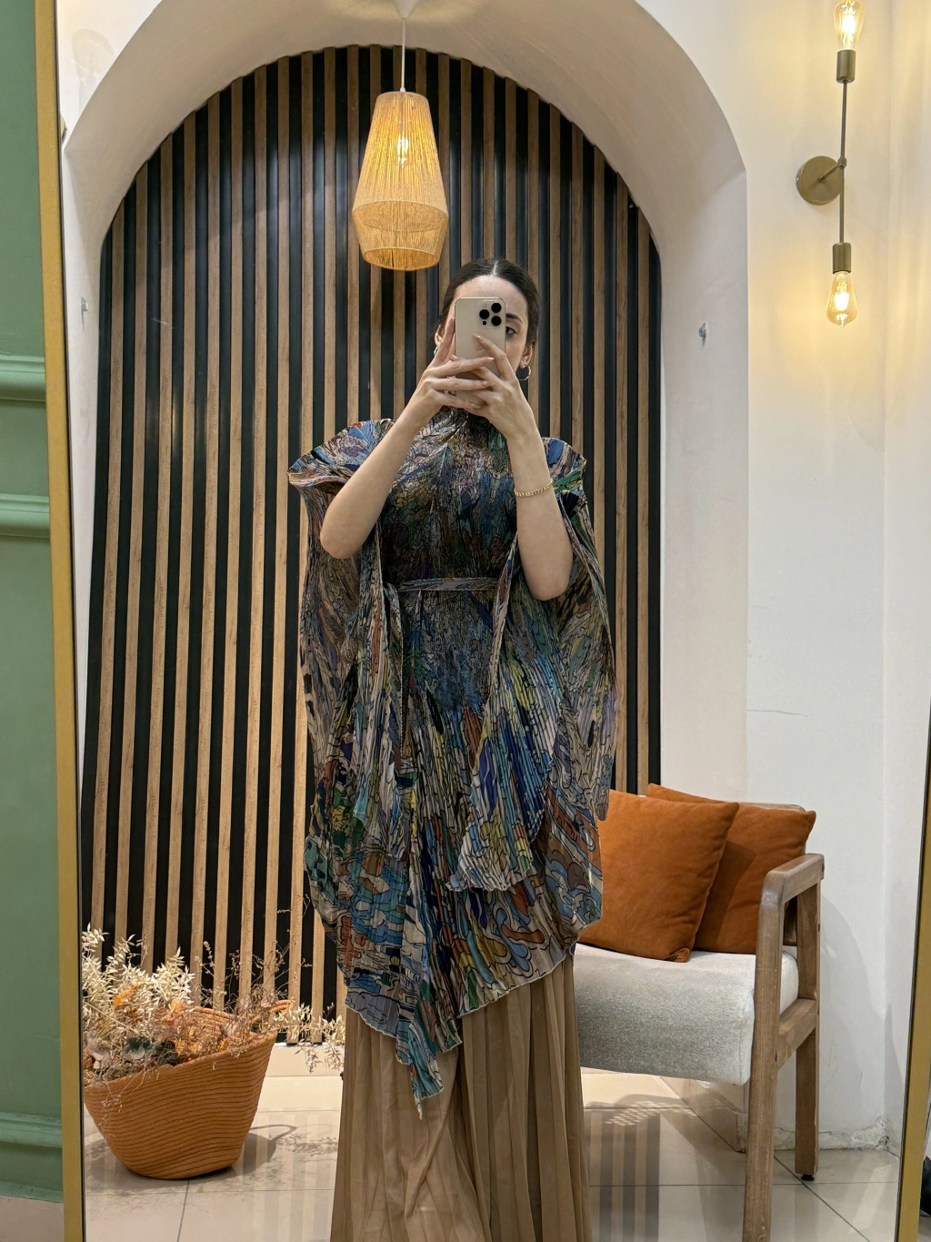 Hera Desenli Şifon İkili Takım, etek görünümündeki pantolonu sayesinde hem zarif hem de konforlu bir kullanım sunar. Akışkan şifon dokusu ve hareketli pliseli yapısı ile yürüdükçe şıklığını ortaya çıkarır.