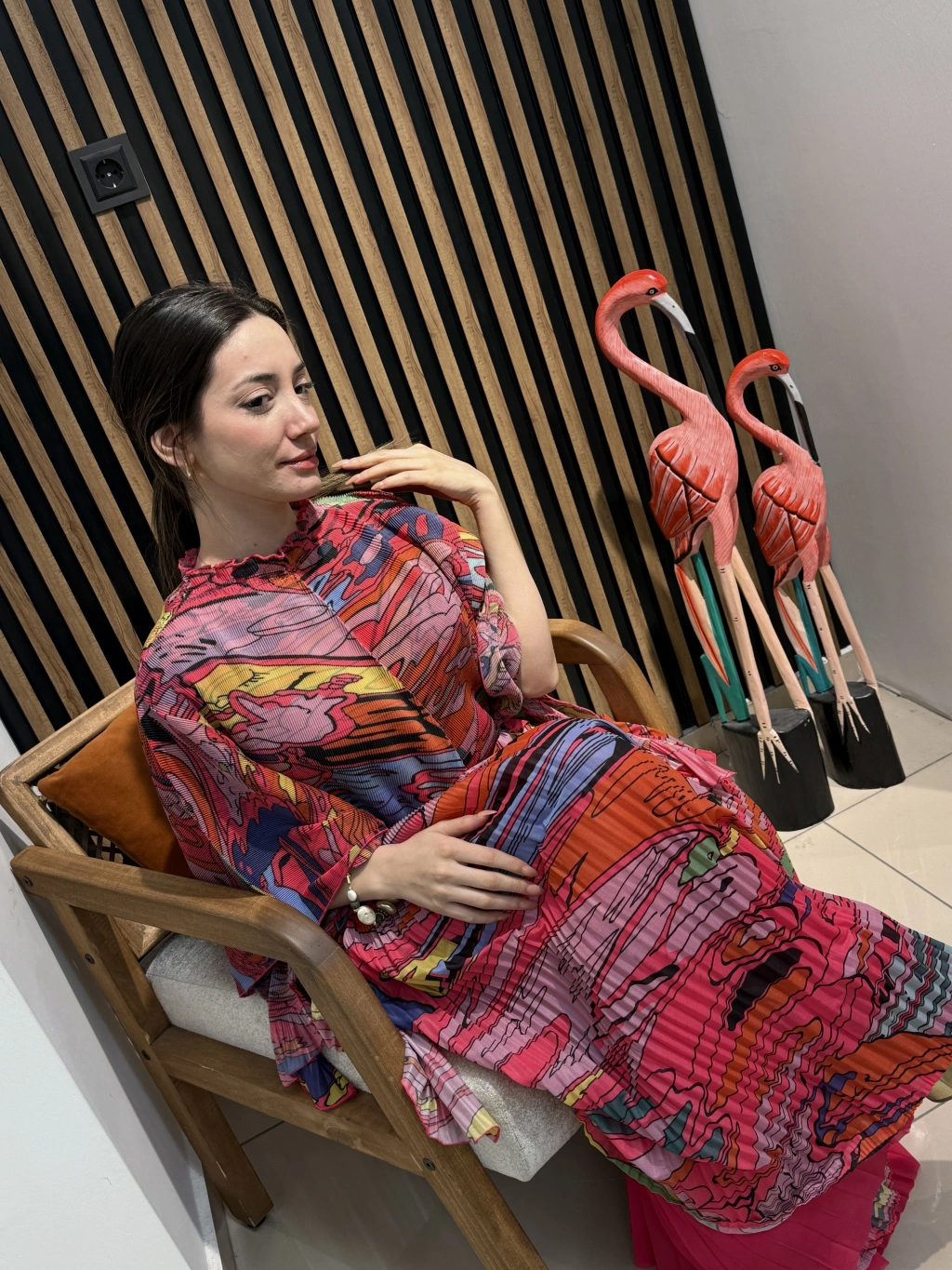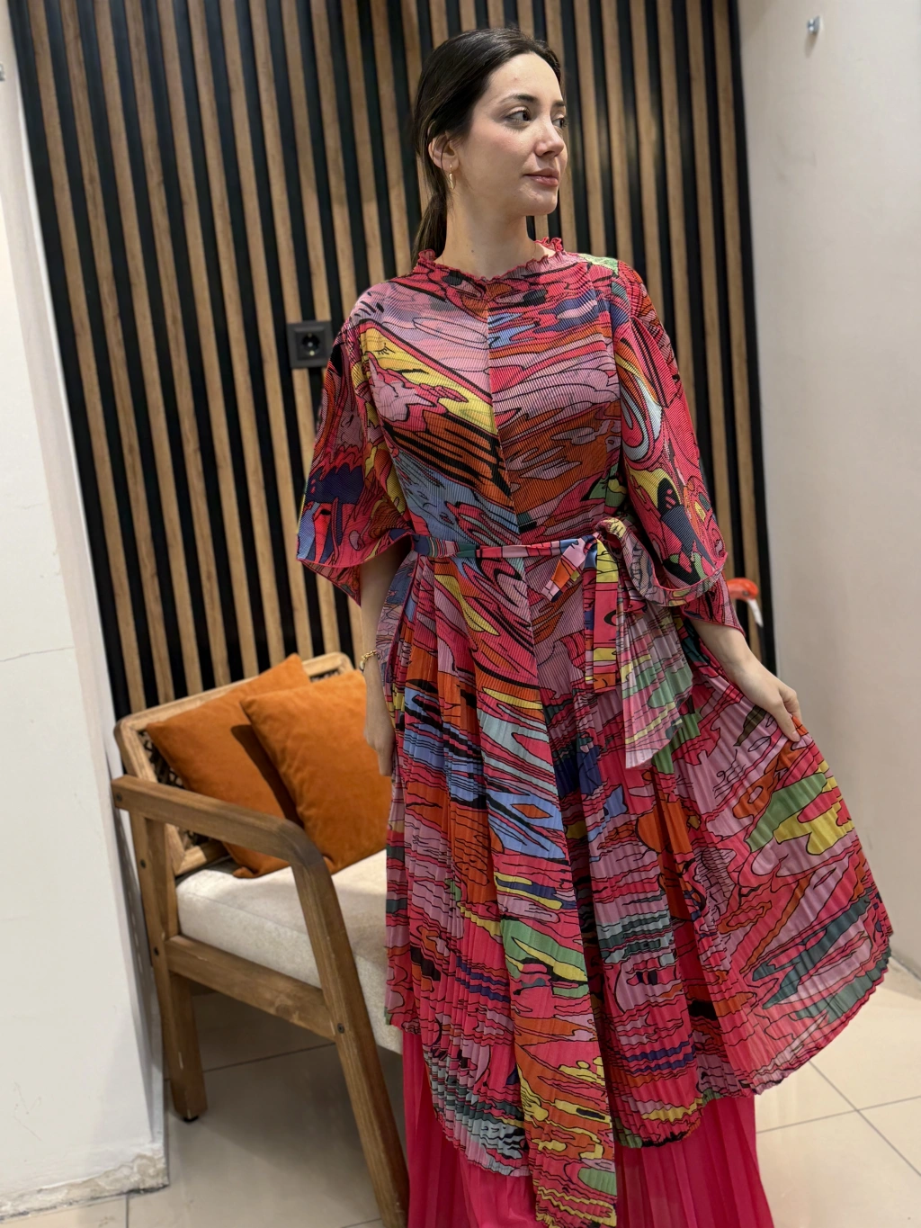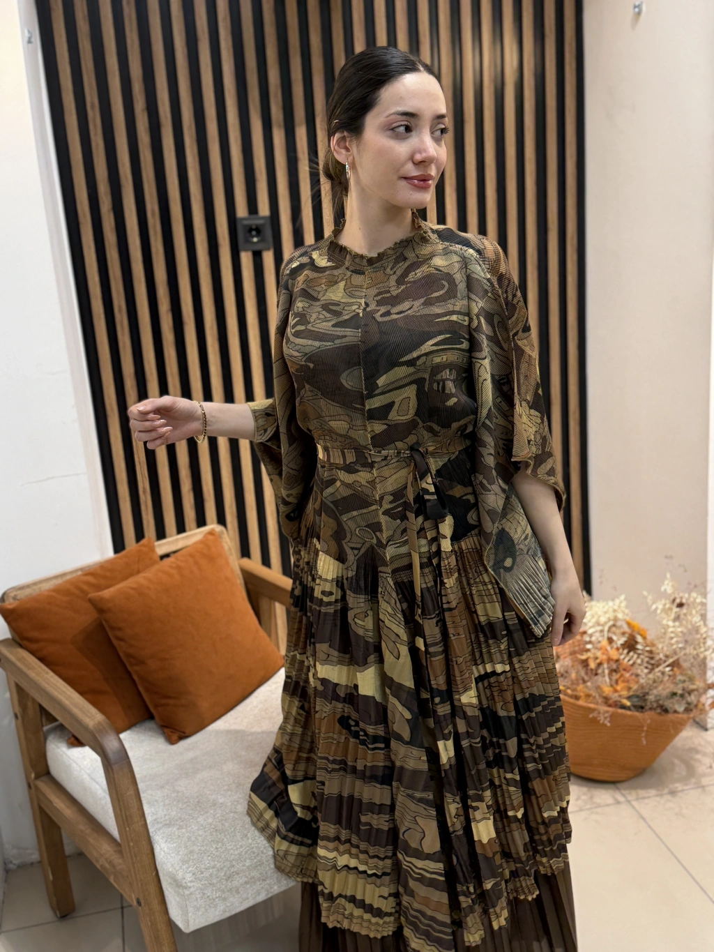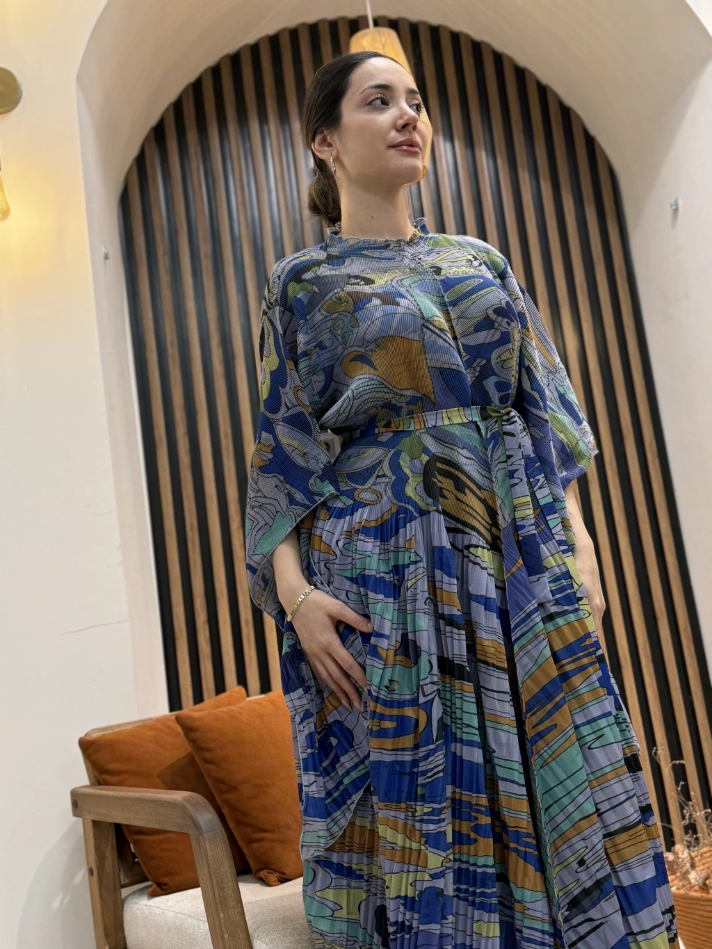 Akışkan şifon dokusu ve pliseli yapısı sayesinde hareketli ve dikkat çekici bir görünüm oluştururken, yarasa kol kesimi modern bir duruş sağlar. Belden bağlamalı kuşak detayı ise vücuda zarif bir form kazandırır.