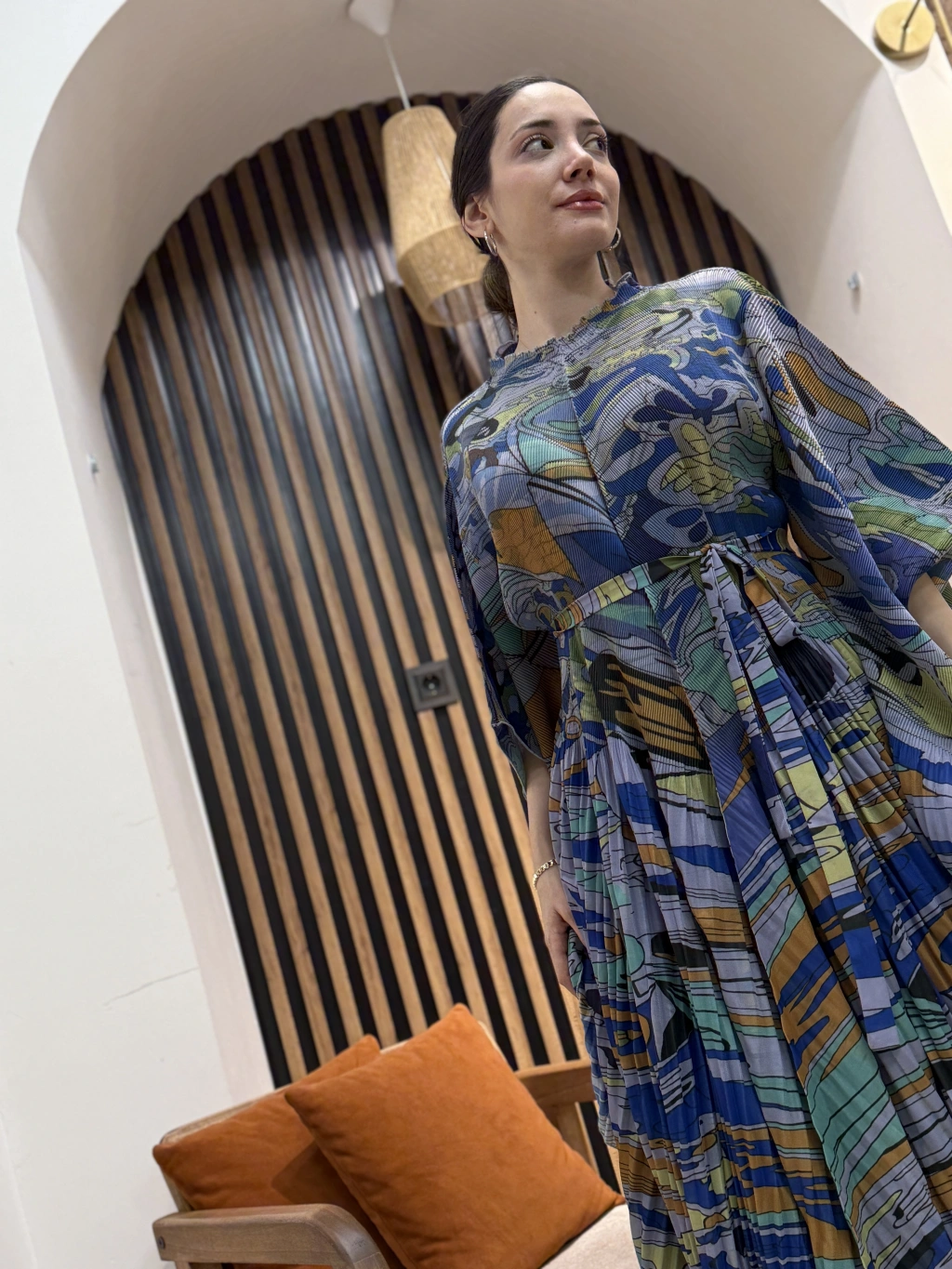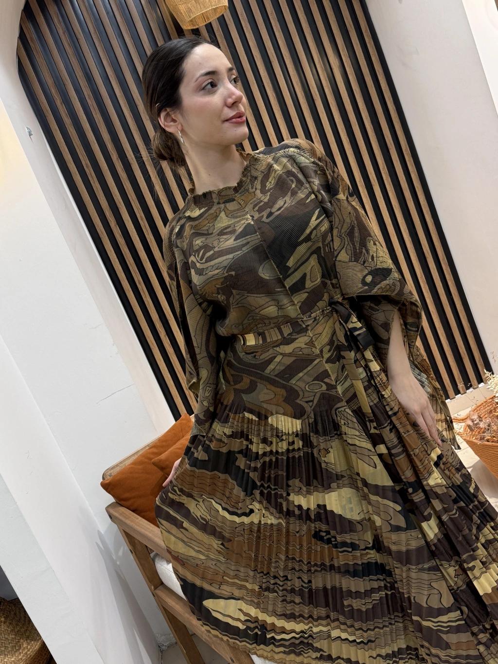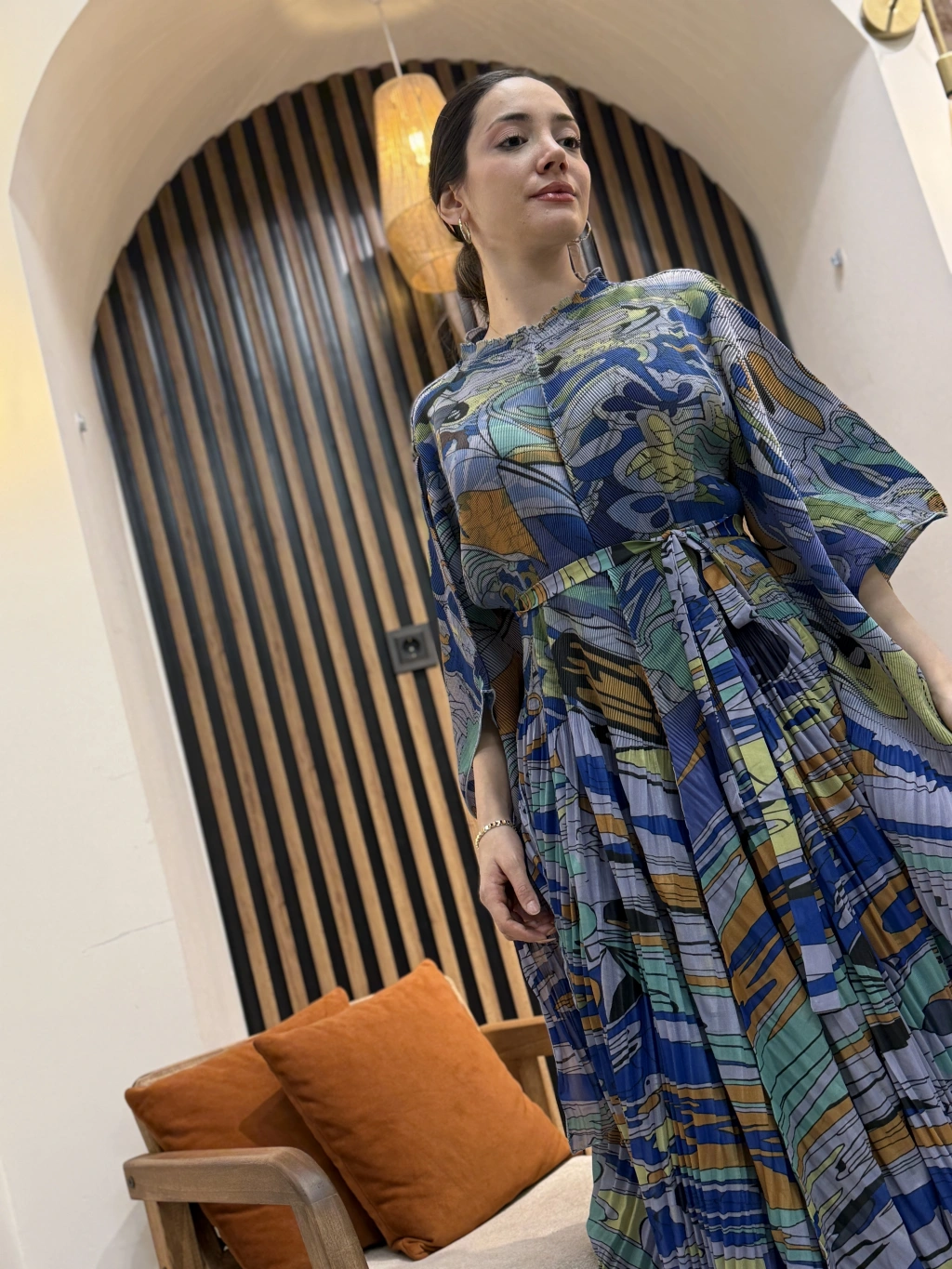 Akışkan şifon dokusu ve pliseli yapısı sayesinde hareketli ve dikkat çekici bir görünüm oluştururken, yarasa kol kesimi modern bir duruş sağlar. Belden bağlamalı kuşak detayı ise vücuda zarif bir form kazandırır.