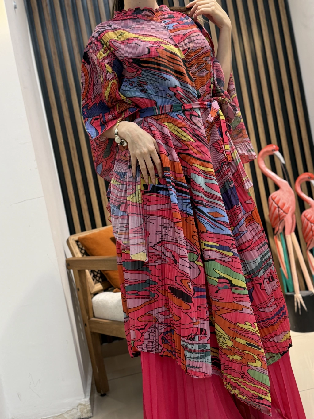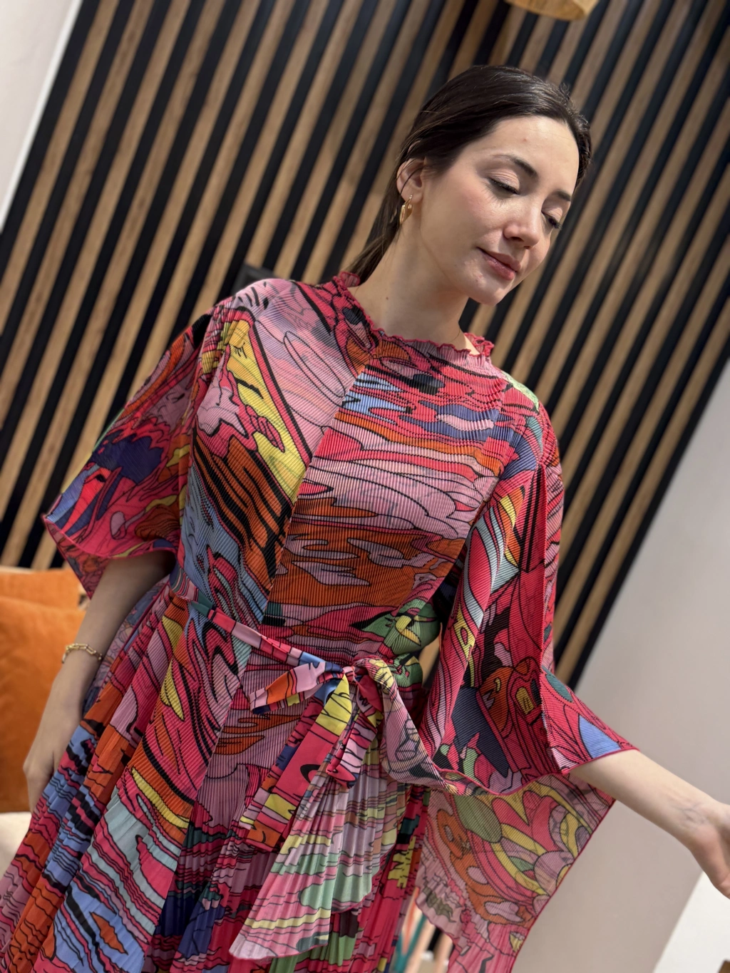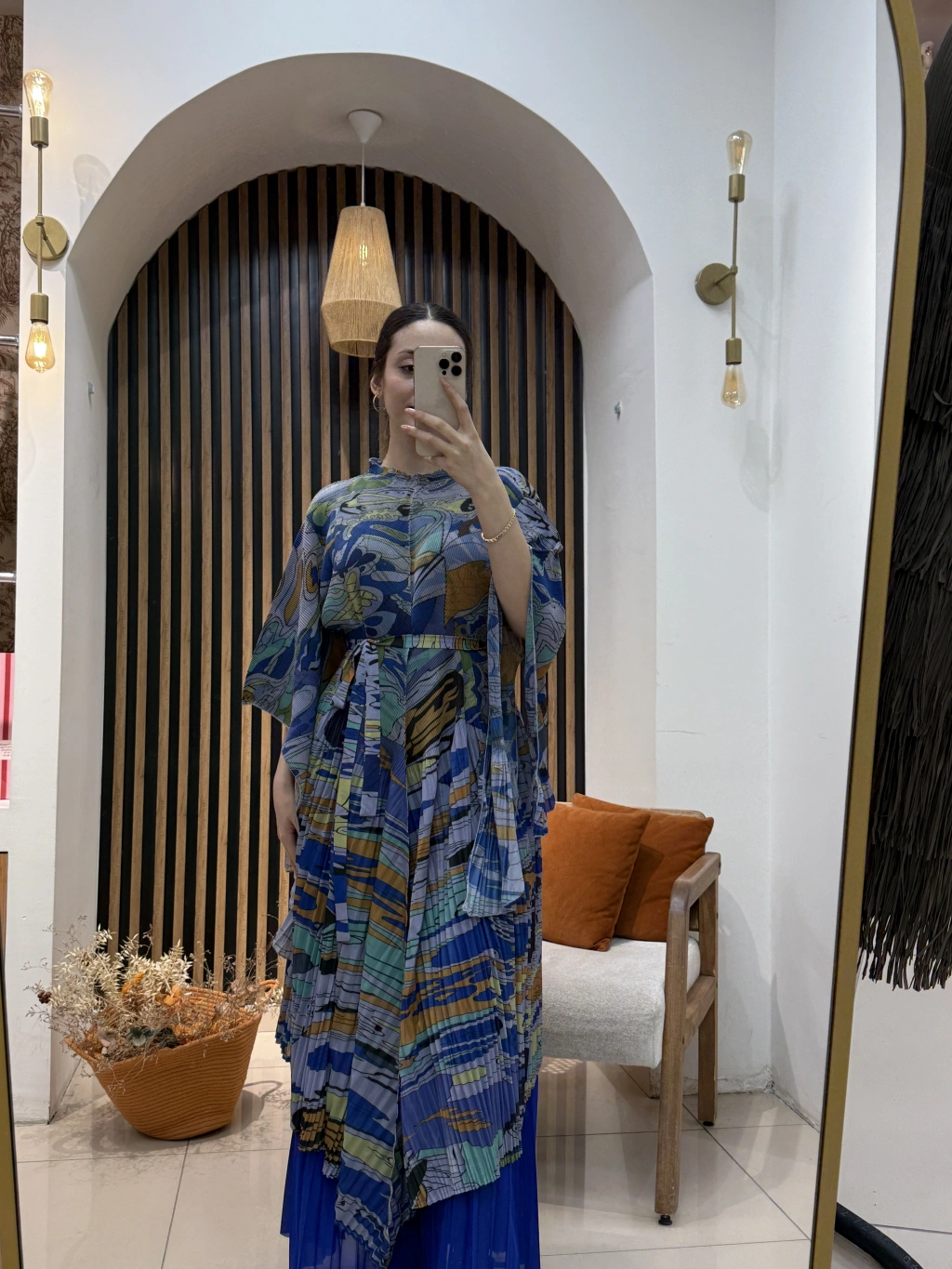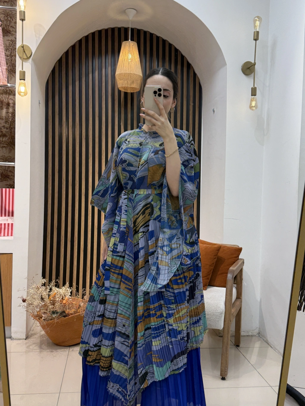 Akışkan şifon dokusu ve pliseli yapısı sayesinde hareketli ve dikkat çekici bir görünüm oluştururken, yarasa kol kesimi modern bir duruş sağlar. Belden bağlamalı kuşak detayı ise vücuda zarif bir form kazandırır.