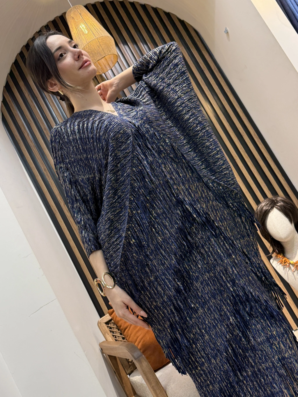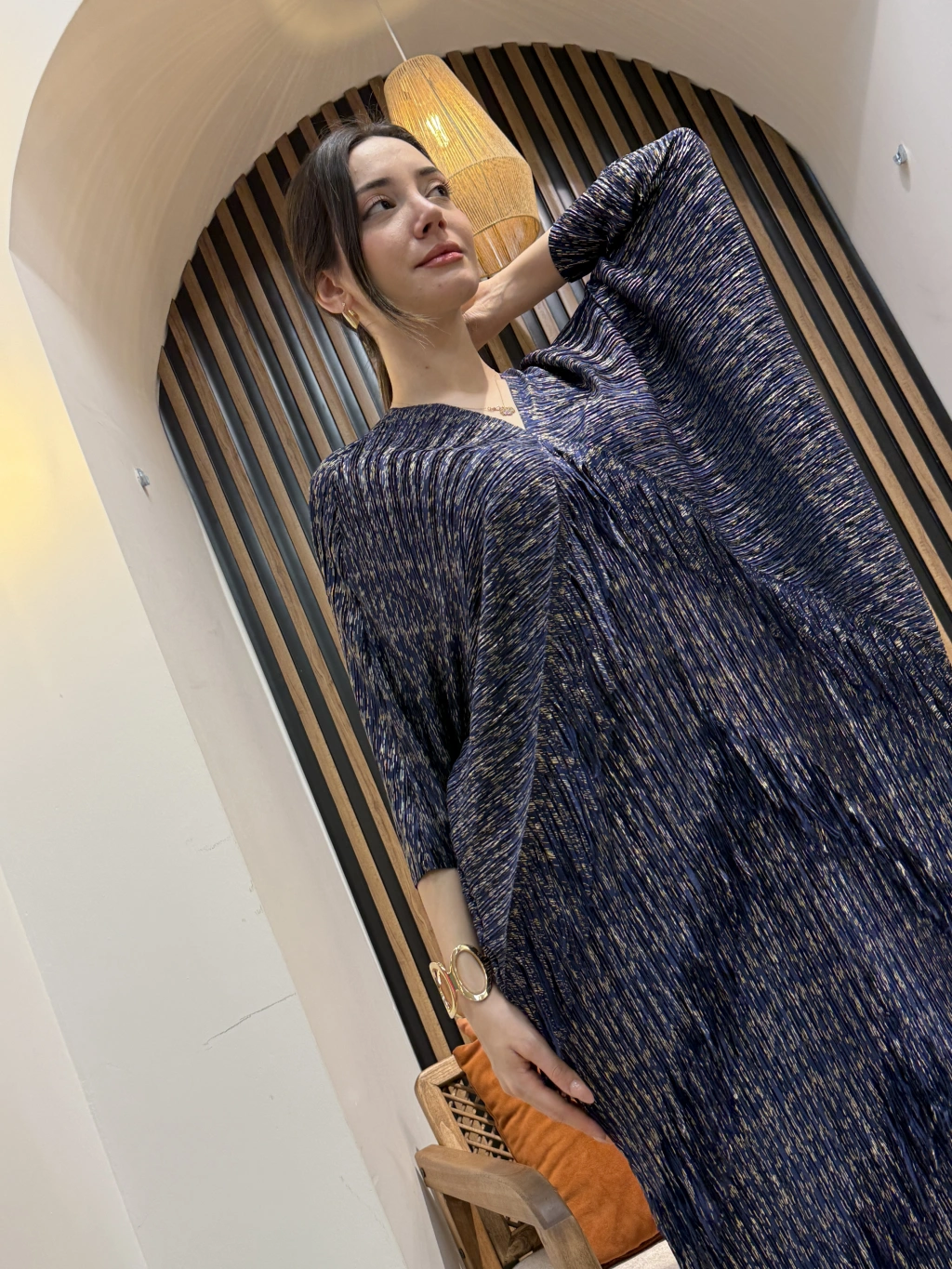 Mira Simli Pliseli Elbise, rahat kalıbı ve hareketli pliseleri sayesinde gün boyu konfor sunar. Gold yansımalı kumaşı ışıkta zarif bir ışıltı oluşturur.
