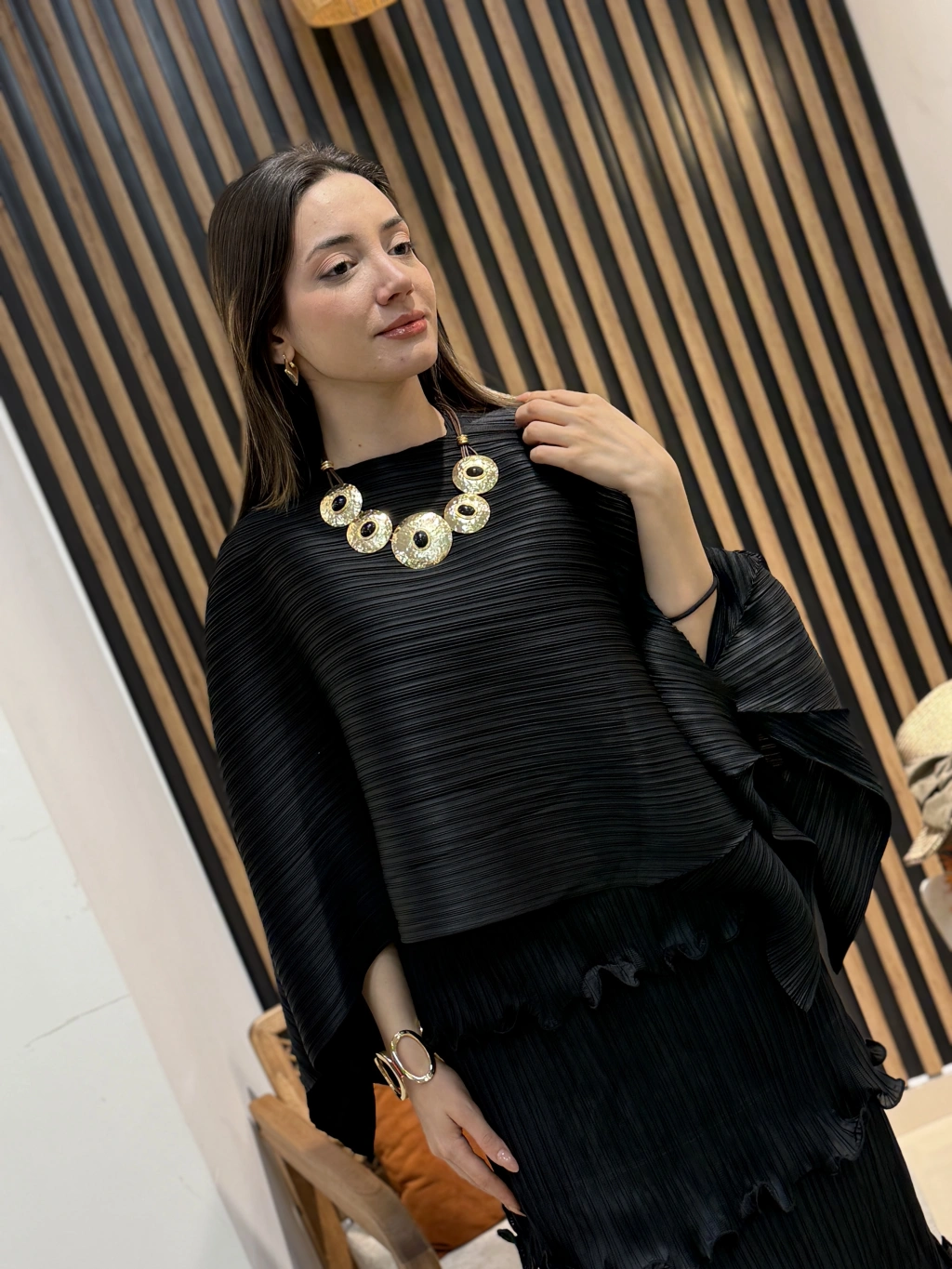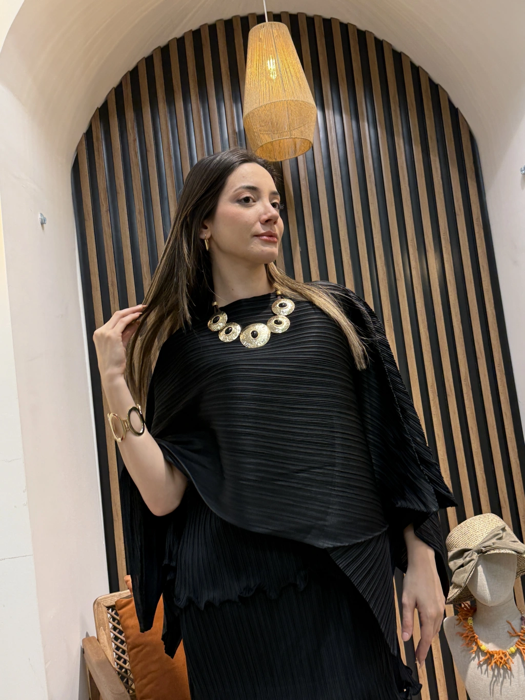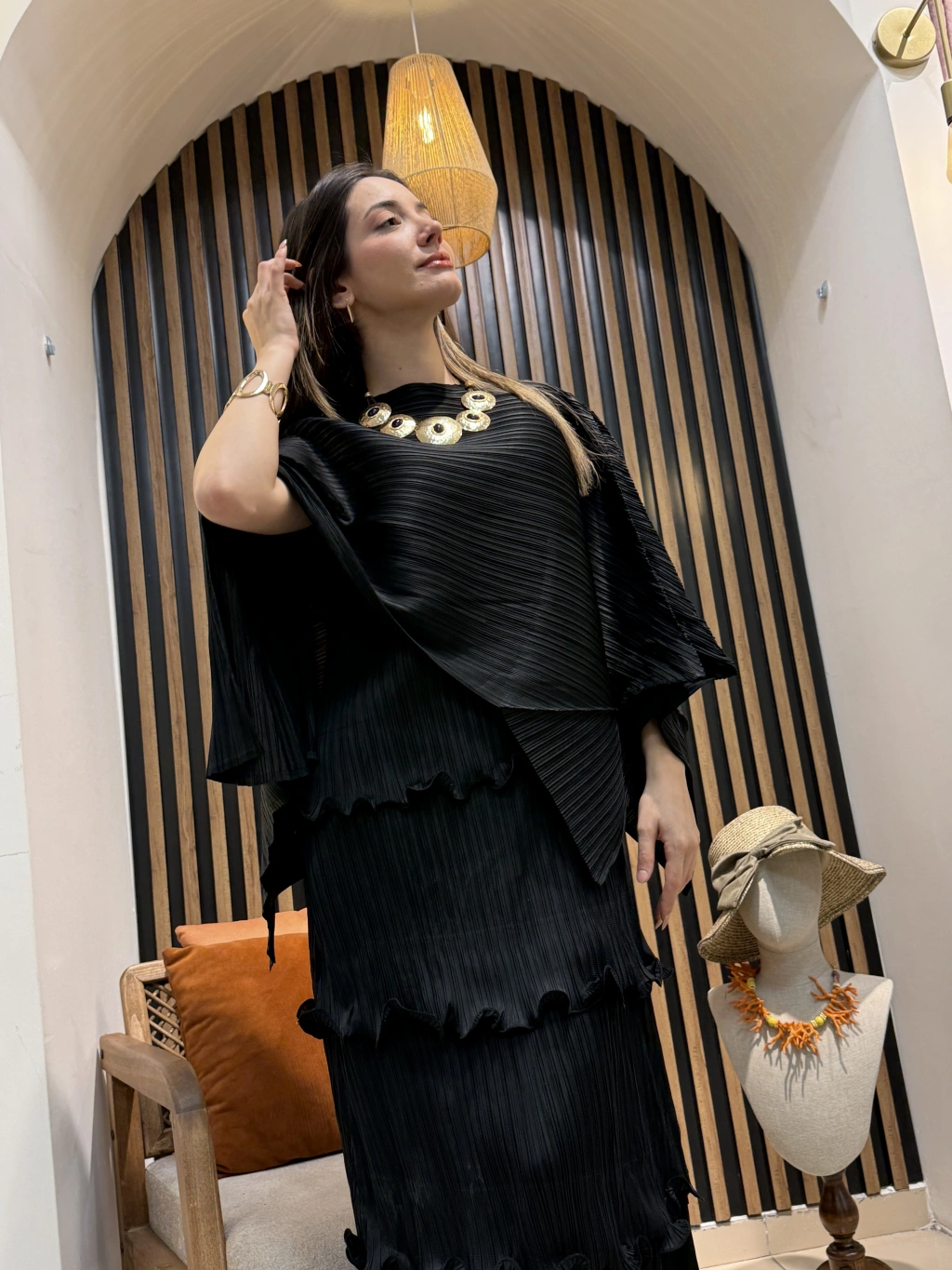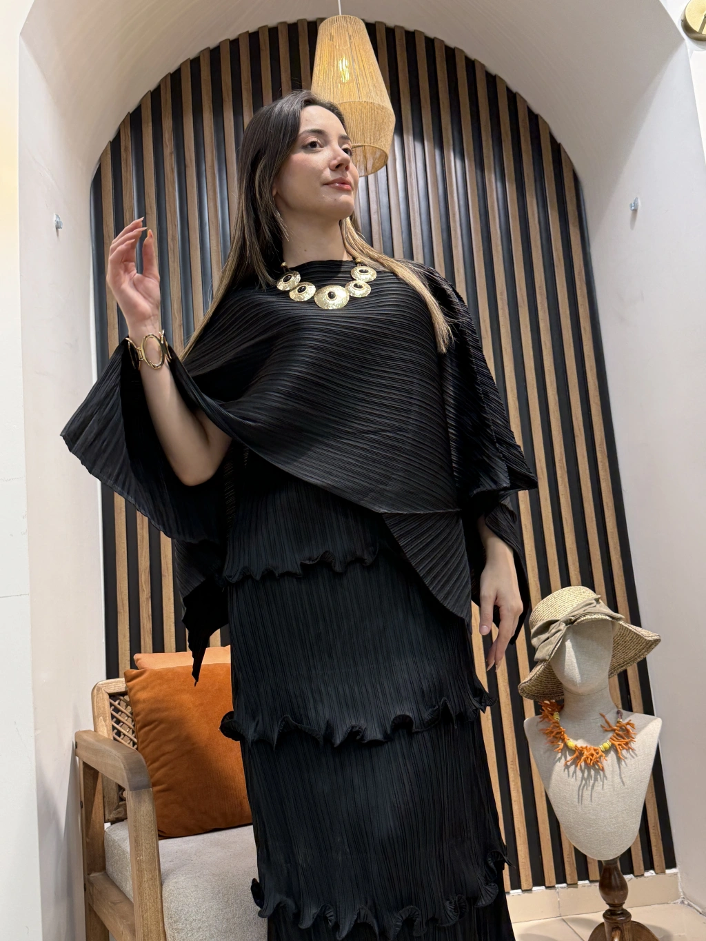 Noire Pliseli Pelerin Elbise, akışkan dokusu ve pelerin form üst tasarımı ile sofistike bir duruş sunar. Katlı etek detayı hareket kazandırırken siyahın asil gücü stilinizi tamamlar.