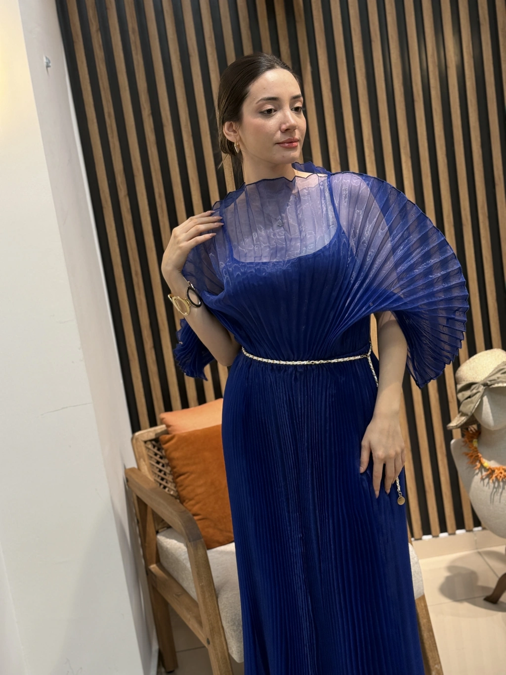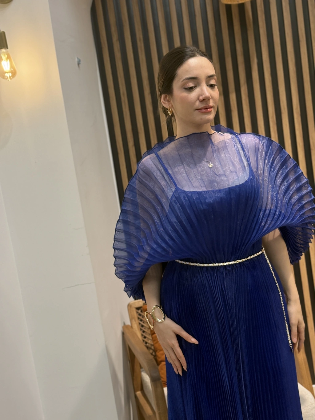 Royal Transparan Pliseli Elbise, ince pileli şifon görünümlü üst tasarımı ve akışkan etek formuyla sofistike bir siluet sunar. Bel kısmındaki zarif kemer detayı vücut formunu dengelerken, saks mavisinin güçlü tonu stilinizi ön plana çıkarır.